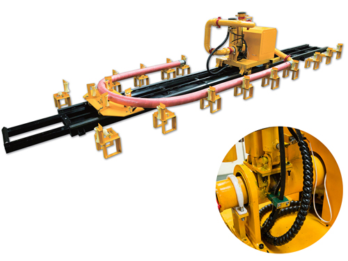 模板臺車送料系統適用于模板臺車混凝土砂漿自動輸送工藝,可以實現注漿頭長度方向行走,左、上、右三個方向的旋轉和伸縮,可以滿足模板臺車各個注漿口的注漿工作;并配有清洗頭用于分支膠管內的混凝土砂漿的清洗工作。進料管采用軟管垂直連接,接管簡化、出料管采用伸縮式結構,減少管道彎道,降低管道阻力,消除堵管的隱患。